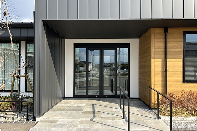黒のガルバリウムと木目が目を引く建物が高松オフィスです。