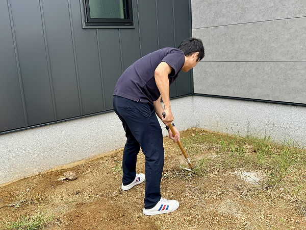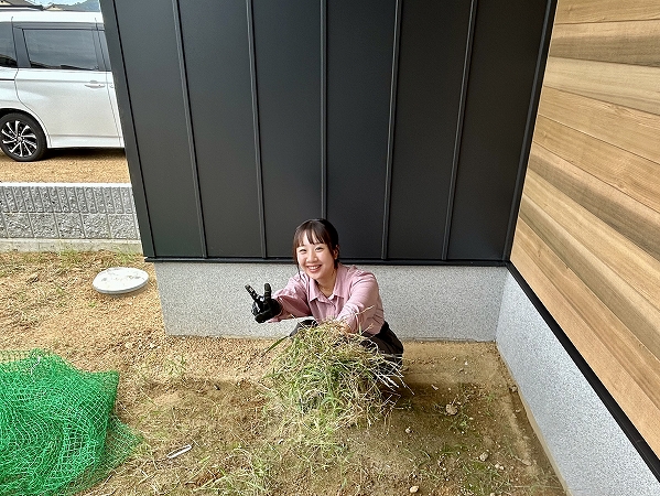 白井にカメラを向けると笑顔で抜いた雑草を掲げてくれました。