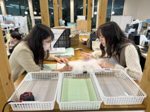 先日、設計の安徳とコーディネーターの森澤がお客様との最終確認打合せを終えた後、会議をしている様子をパシャリ。