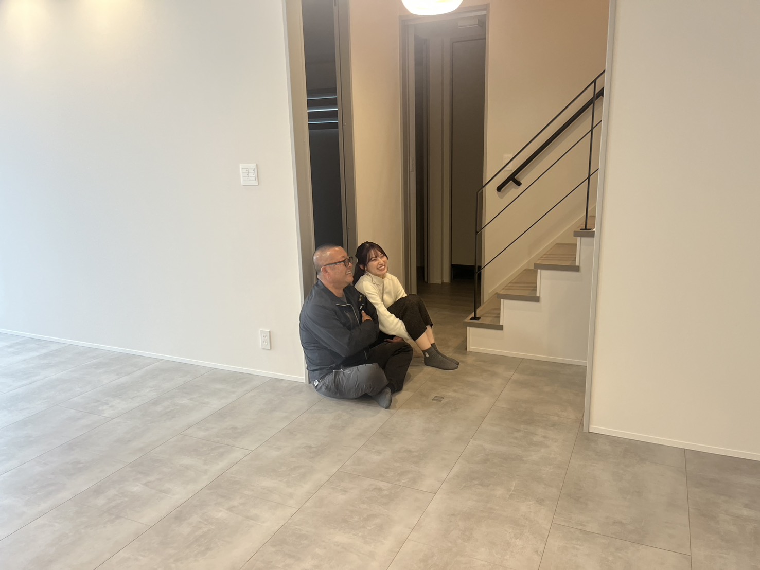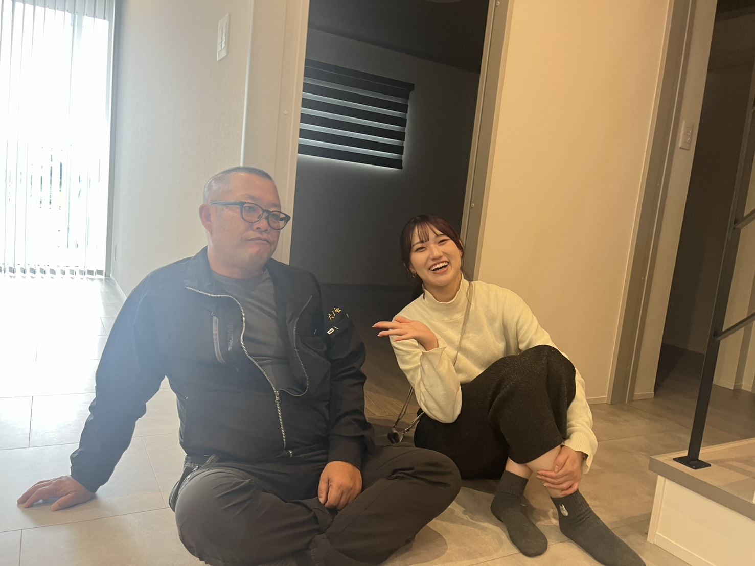 仲良く座って何かを見つめている現場監督の六車とICの石丸。