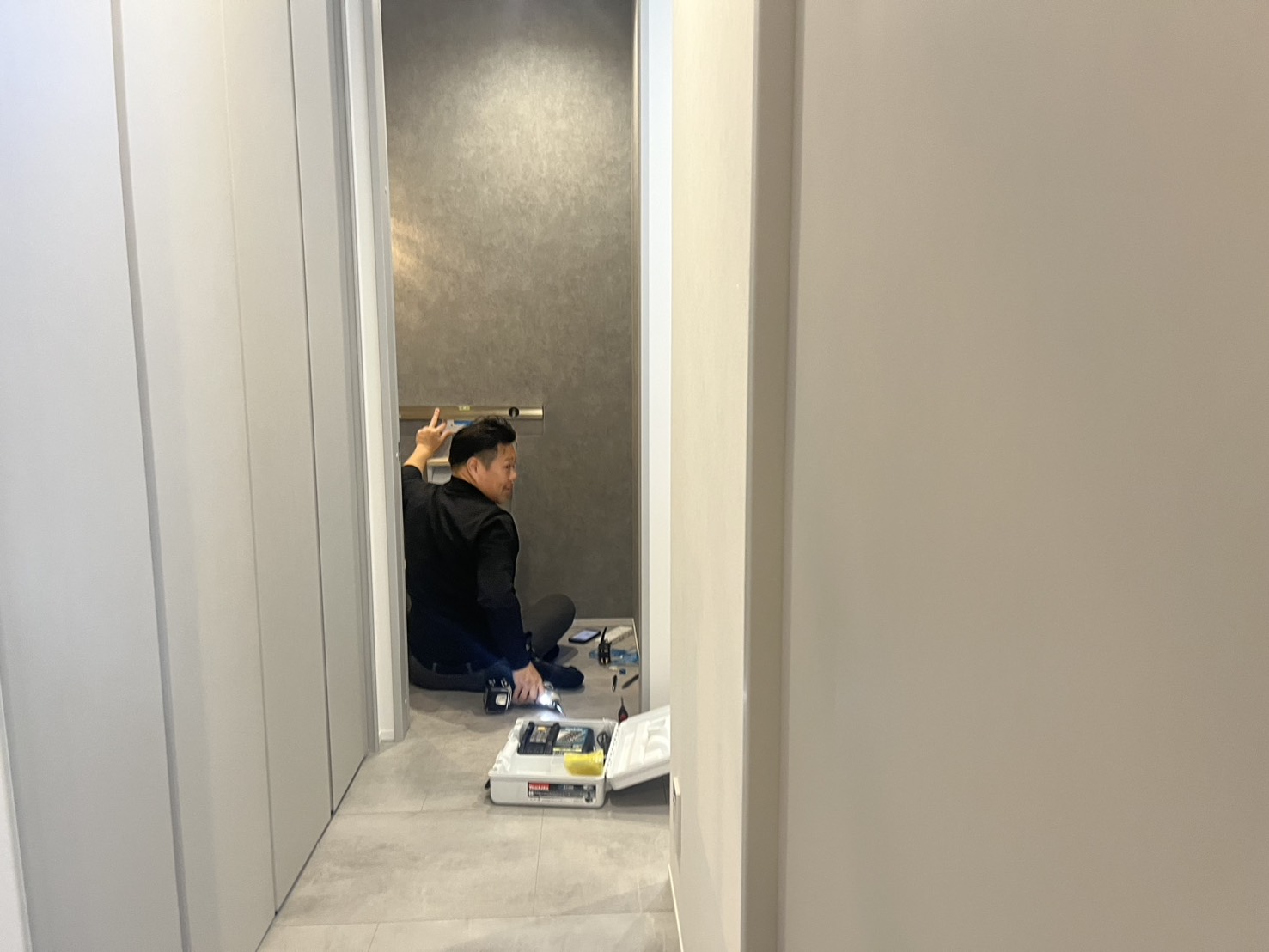 トイレのリモコンを取り付けている安江を発見!