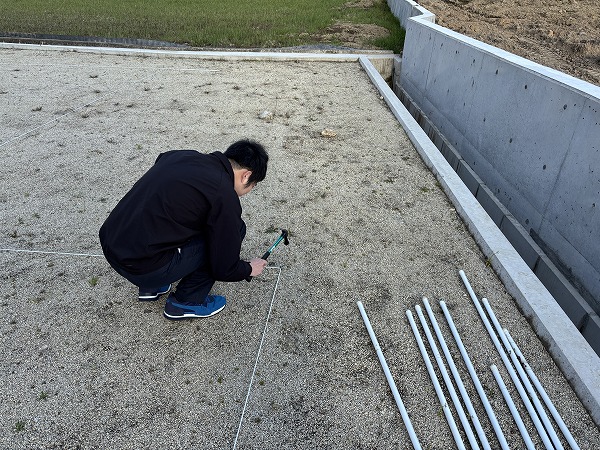 この日は、これから工事が始まる現場で測量と地縄を行いました。