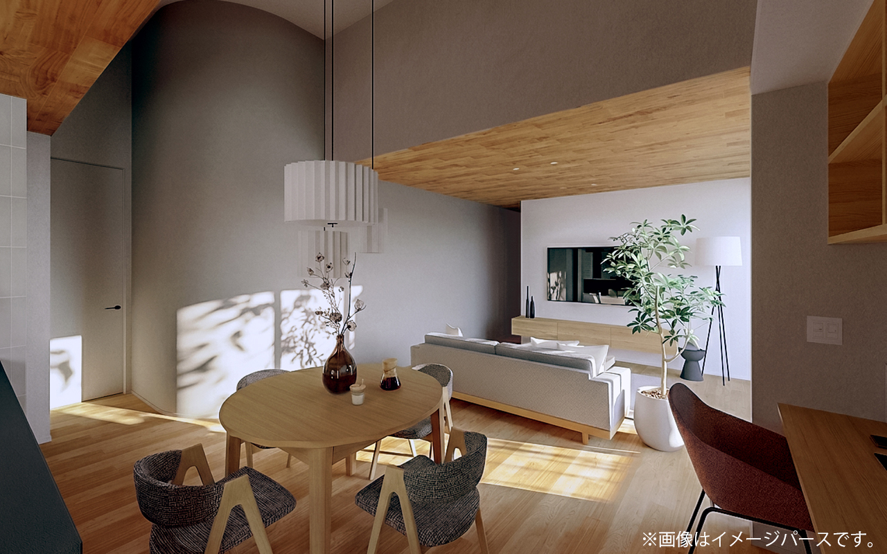 天井高の違いや、アールの壁がアクセントになっています。