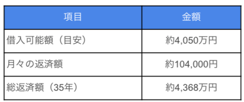 ※ 実際の借入可能額は、金融機関の審査基準やその他の債務状況によって異なります。