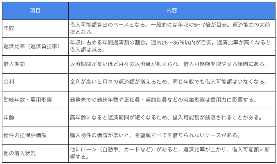 「年収倍率」と「返済負担率」以外の要素も含めて表でご紹介します。