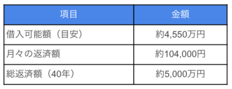また、仮に同じ条件で返済期間が40年の場合の借入可能額は以下になります。