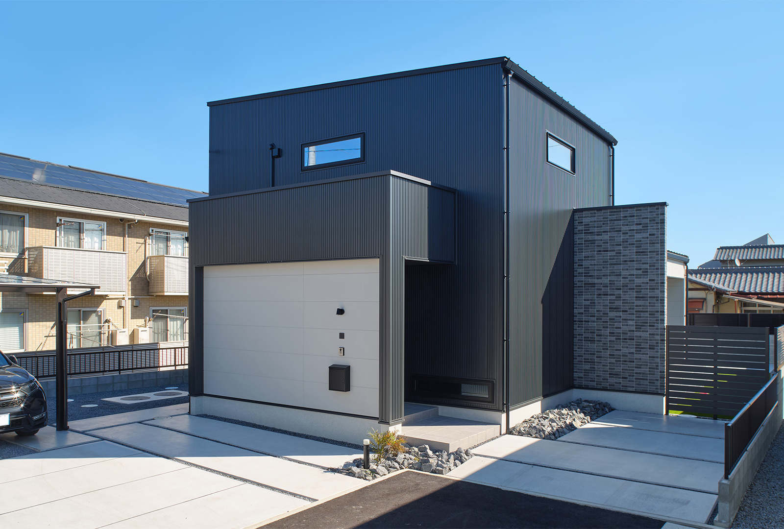 完成した住まいは、ブラックのガルバがスタイリッシュなモノトーンのお家。外構はメンテナンスのしやすさを第一に考え、シンプルに仕上げています。