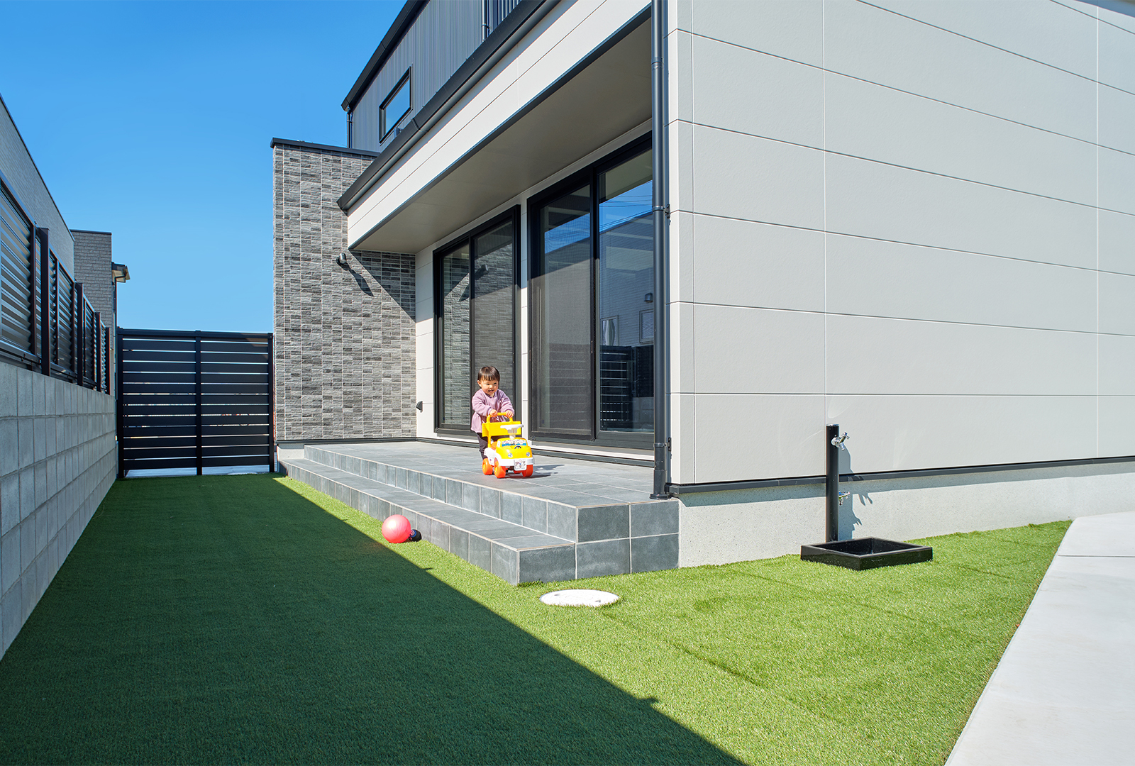 周囲からは見えにくいプライベート感のある庭も設け、アパートでは叶わなかった、お子さんがのびのびと遊べる場所になりました。