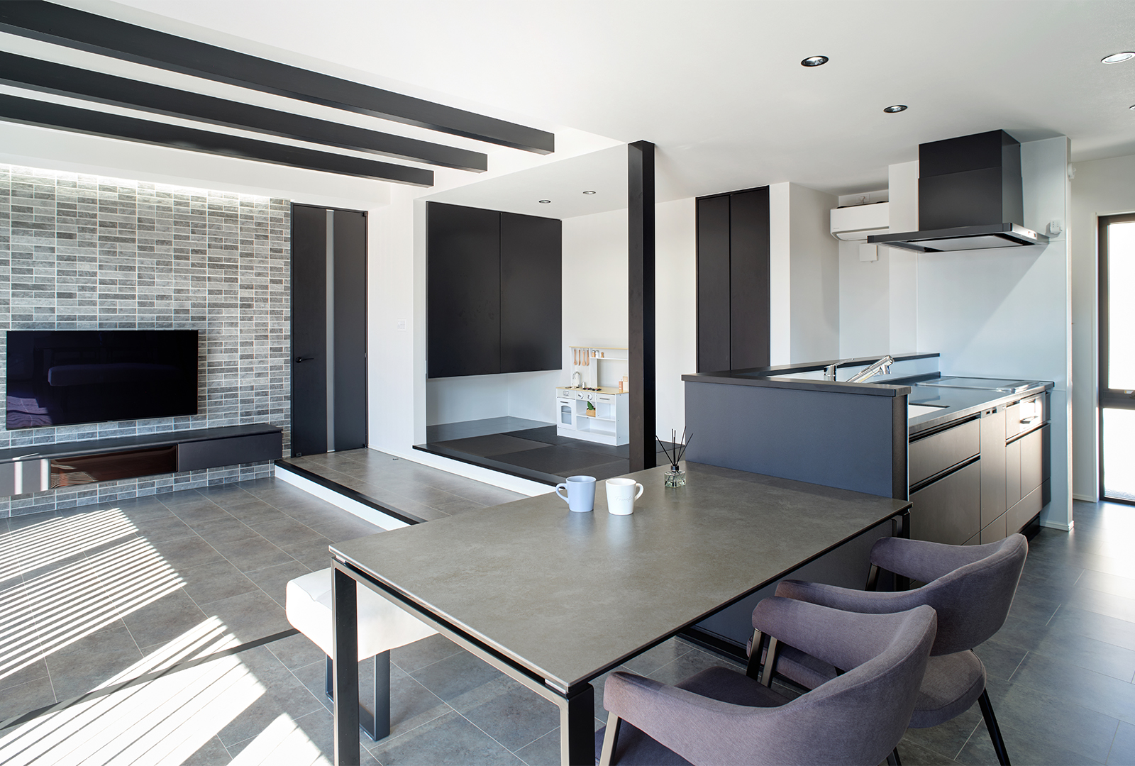 邸内も、床材やクロス、和室の畳までM様がこだわったモノトーンで統一し、かっこいい空間に。便利な回遊動線にすることで、家事効率アップも実現しました。