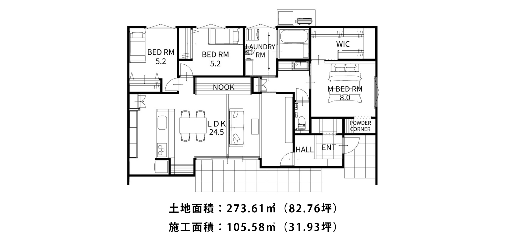 上記の間取りの例では、廊下を少なくしてランドリールームやウォークインクローゼットを広く取ることで家事がしやすくなっています。ヌックやパウダーコーナーなどの贅沢空間も確保して暮らしやすさと心地よさの両方を叶えました。