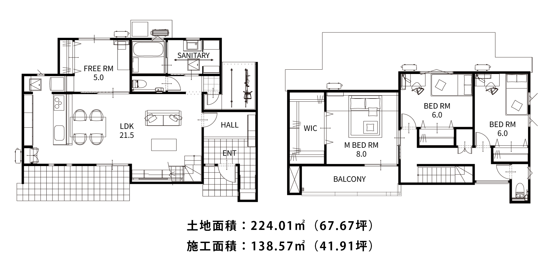 上記の間取りの例では、1階に広々としたLDKと5帖のフリールームを配置し、家族の集いと自由な活用を実現。2階には寝室や子ども部屋のほか、大容量のウォークインクローゼットや広めのバルコニーを設け、収納力と開放感も兼ねそろえています。
