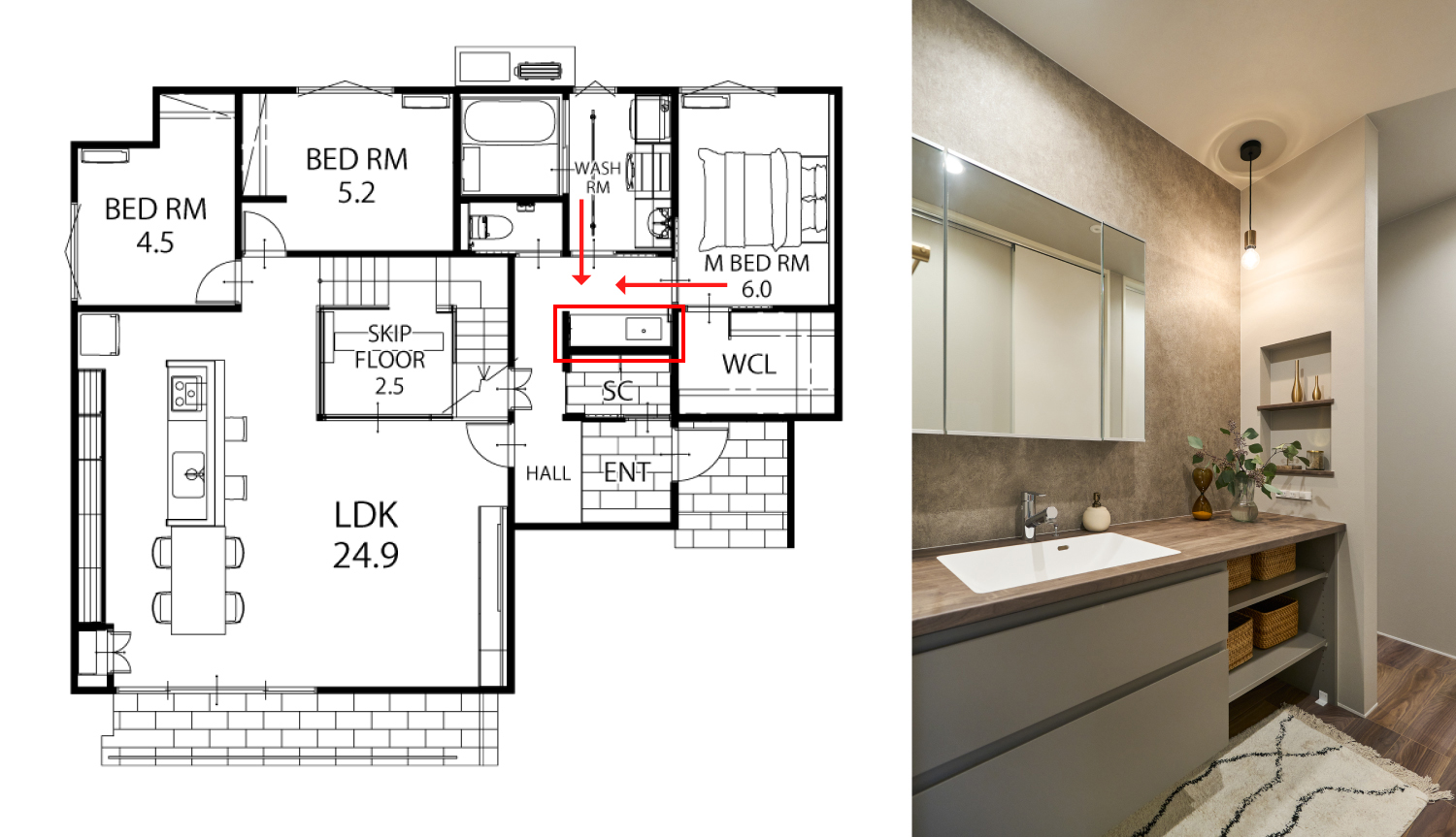 この施工事例ひとつで、寝室動線・浴室動線・収納アイデアをすべて兼ね備えた快適な洗面所を実現しています。