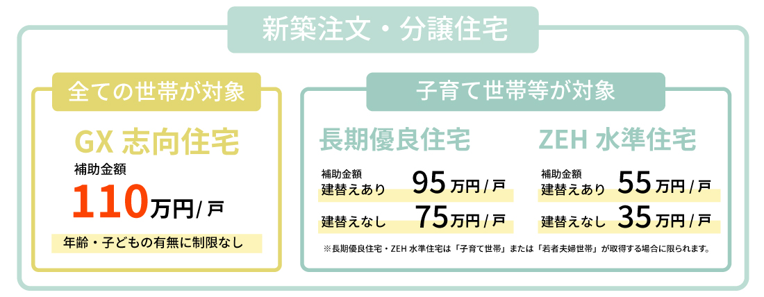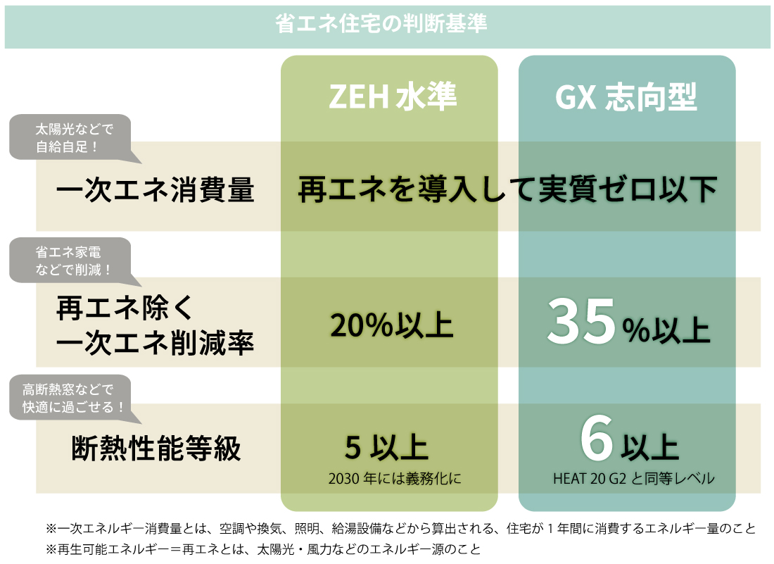 この制度の目的は、住宅分野の省エネ投資の下支えを行うことです。現在カーボンニュートラルの実現に向けて、長期的な建物を保持していくために「ZEH水準住宅」や「長期優良住宅」の新築、さらには特に高い省エネ性能を有する「GX志向型住宅」の新築が望まれています。