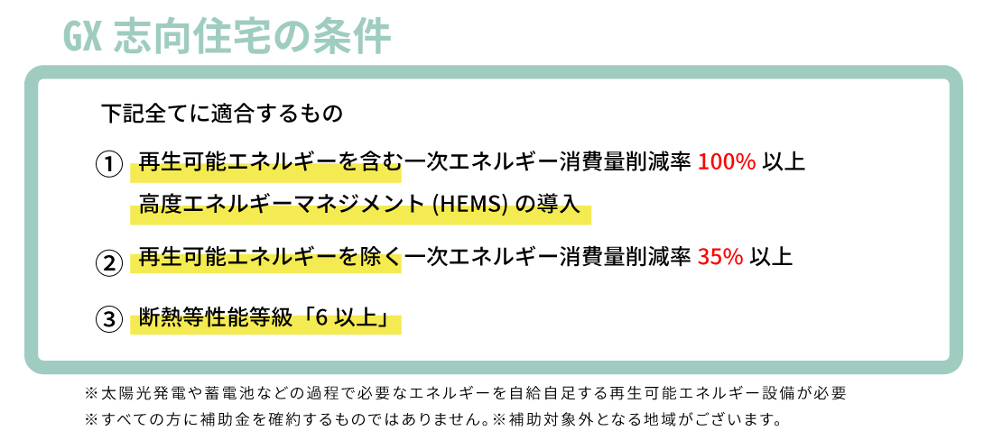 補助額110万円の対象となるためには、前述したGX志向型住宅となる以下の条件が必要となります。