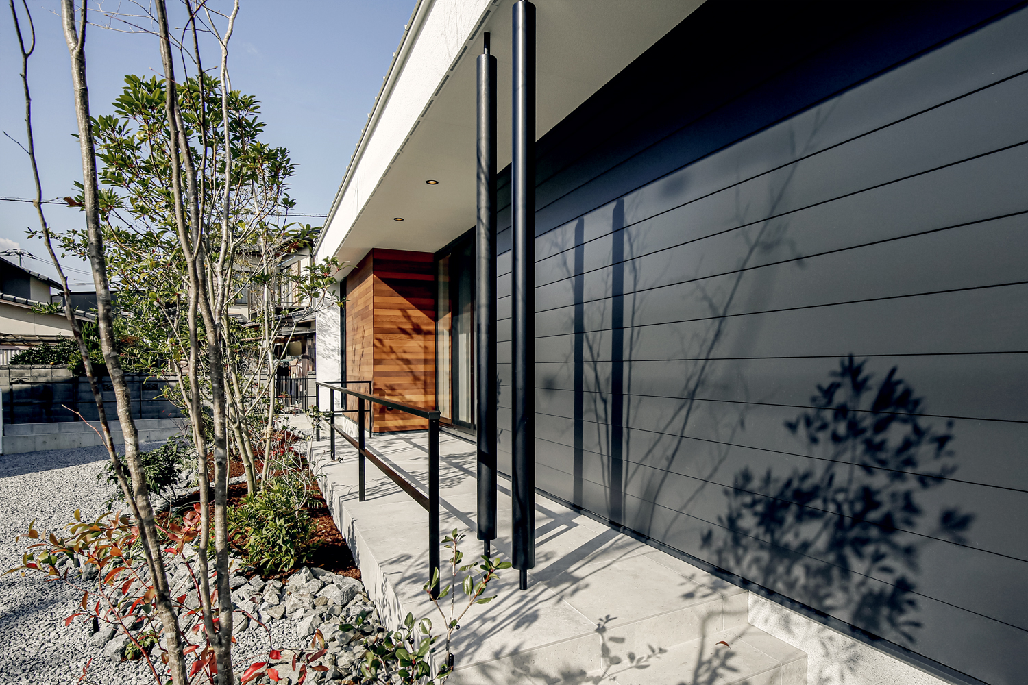 黒のガルバリウムに、白の吹付塗装で描いたラインが軽やかさをプラス。木目部分には本物の木を採用し、たっぷりの植栽とともに自然だけが持つ優しさを添えている。
