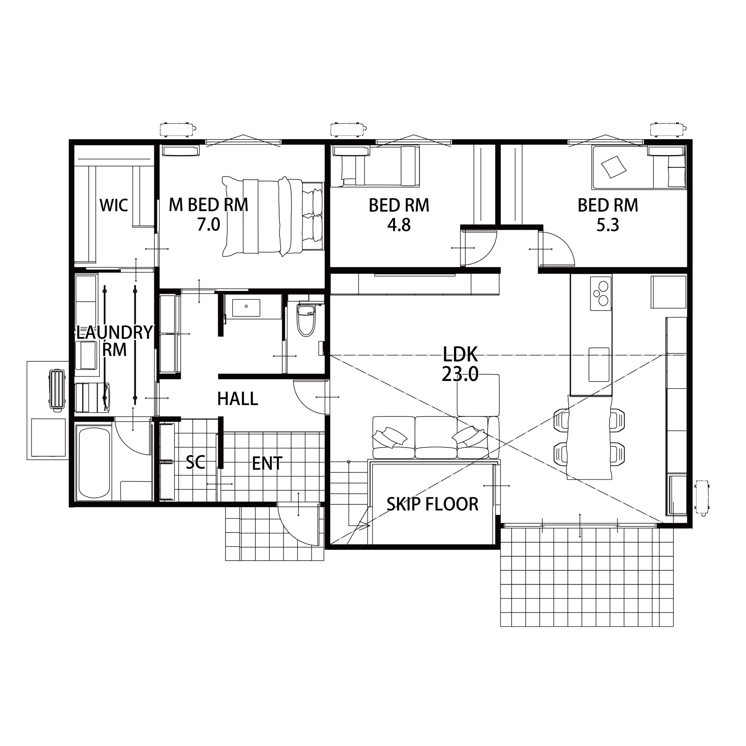 生活の効率を高める回遊動線を設け、使いやすさとデザイン性のバランスが取れた平屋です。
