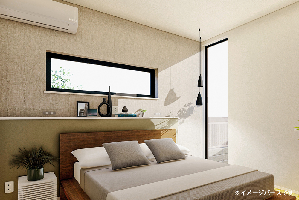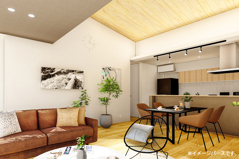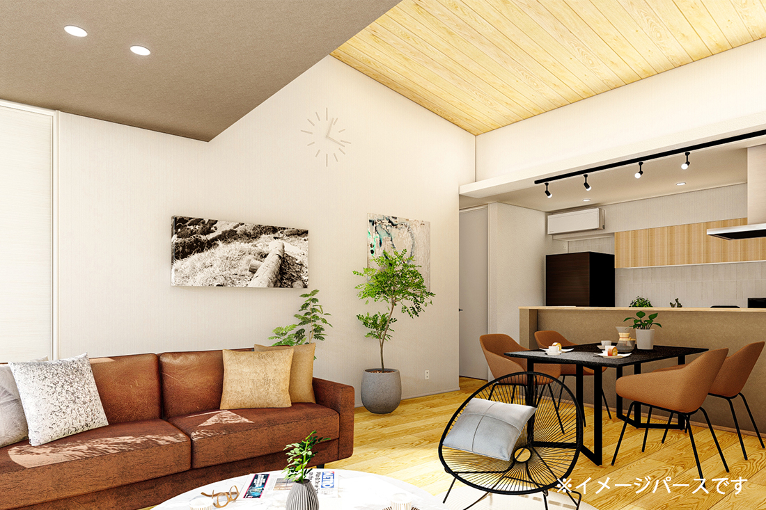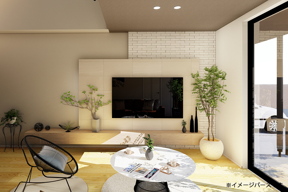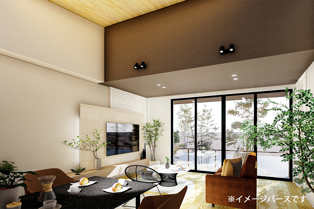 LED照明器具・スピーカー付きダウンライト・カーテン・カーテンレール・エアコン(LDK23畳用・寝室6畳用)・TVコーナー背面エコカラット貼り・LDK勾配天井板張り(アッシュ)・キッチン背面タイル貼り・外構・室内物干し