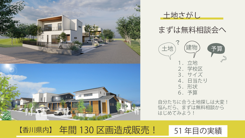 ロータリーハウスは、もともとは不動産会社からスタートしました。地元香川で培ってきた経験を生かし、現在は年間約130区画の土地を造成・販売しています。