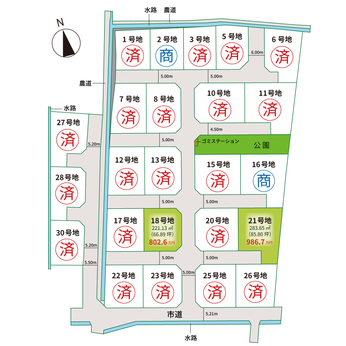 進入口:南側(市道 約5.21m) 分譲地内:(開発道路 約4.5~6m)