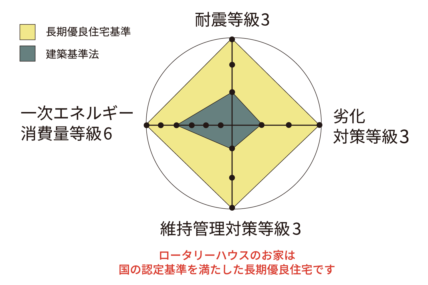 家を考えだした時、構造で考えるのは気密が良くエアコンの効きの良い家、⻑持ちする家、地震に強い家、メンテナンスがしやすい家などがあげられると思います。その1項目だけが優れている家では、満足できる家にはなりません。そのため、⻑期優良住宅の基準としてその4項目は必須項目となっています。その中でロータリーハウスは全て最高等級を取っています。