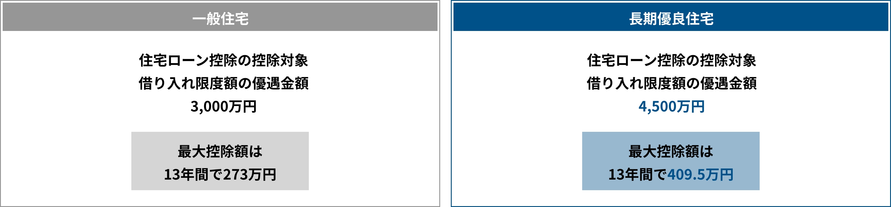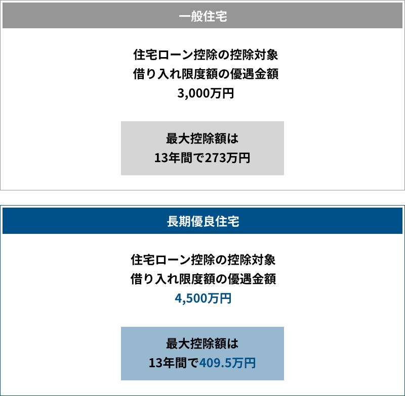 長期優良住宅の場合、住宅ローン控除対象になる借り入れの限度額に優遇が受けられます。省エネ基準適合住宅が3,000万円のところ、長期優良住宅は4,500万円まで引き上げられます。また、控除率は0.7%なので、最大控除額は13年間で409.5万円になります。