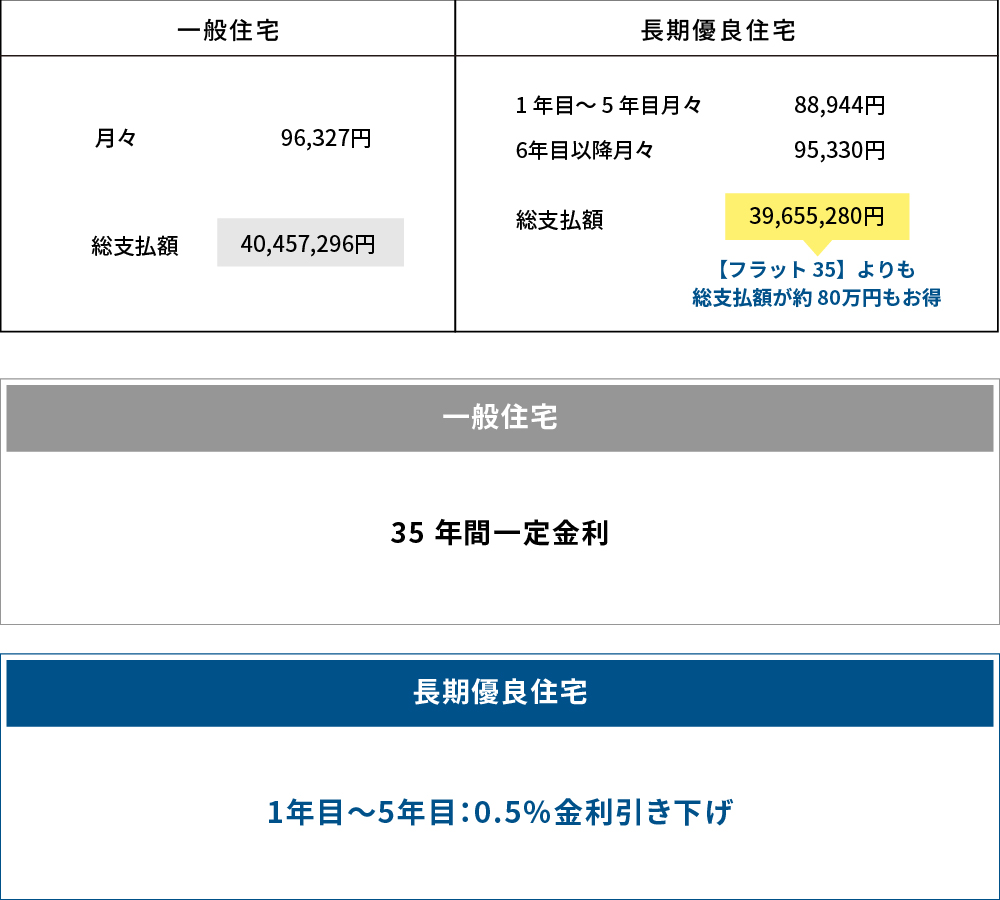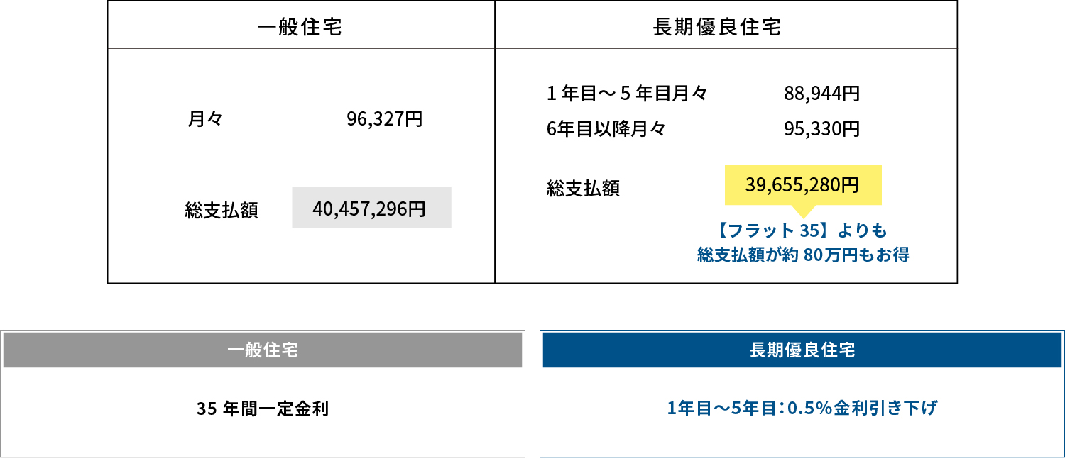 フラット35でお借入れをする場合、長期優良住宅だと、フラット35SのAプランが適用されます。このプランでは、借入期間の最初の5年間は金利が0.5%引き下げられます。
