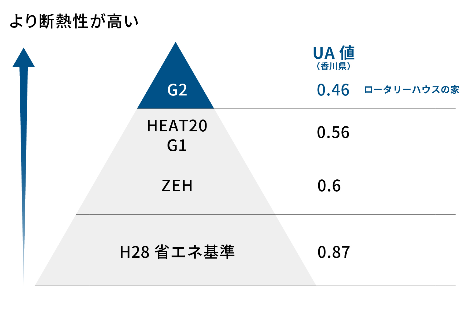 エネルギー基準では、日本を8つの地域(1〜8地域)に分けて基準値を規定しています。香川県は6地域に該当し、ZEH認定に必要なUA値は0.6以下と定められています。ロータリーハウスの家は、寒冷地の3地域(青森県・岩手県・秋田県等)で求められる断熱性に近い性能を実現しています。