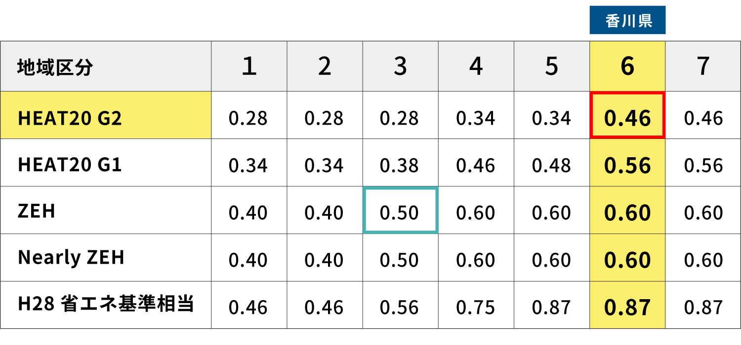 香川県でHEAT20G2水準ということは、寒冷地(青森・岩手・秋田)のZEH水準に相当するということ。