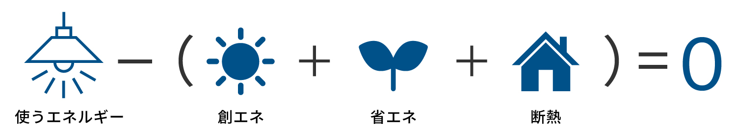 ZEH(ネット・ゼロ・エネルギー・ハウス)とは、消費するエネルギーを減らし、創るエネルギーを増やすことで、