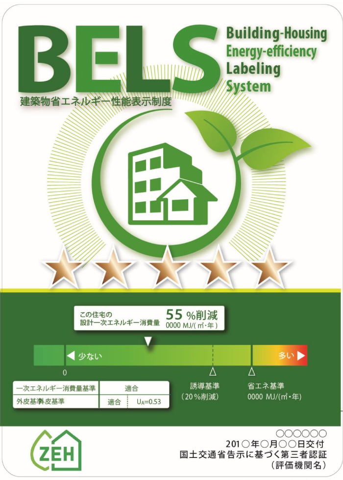 BELS(ベルス)は、国土交通省が定めた「建築物の省エネ性能表示のガイドライン(建築物のエネルギー消費性能の表示に関する指針)」に基づく第三者認証制度の一つ。省エネ性能のランクに応じて5段階の星マークで表示します。