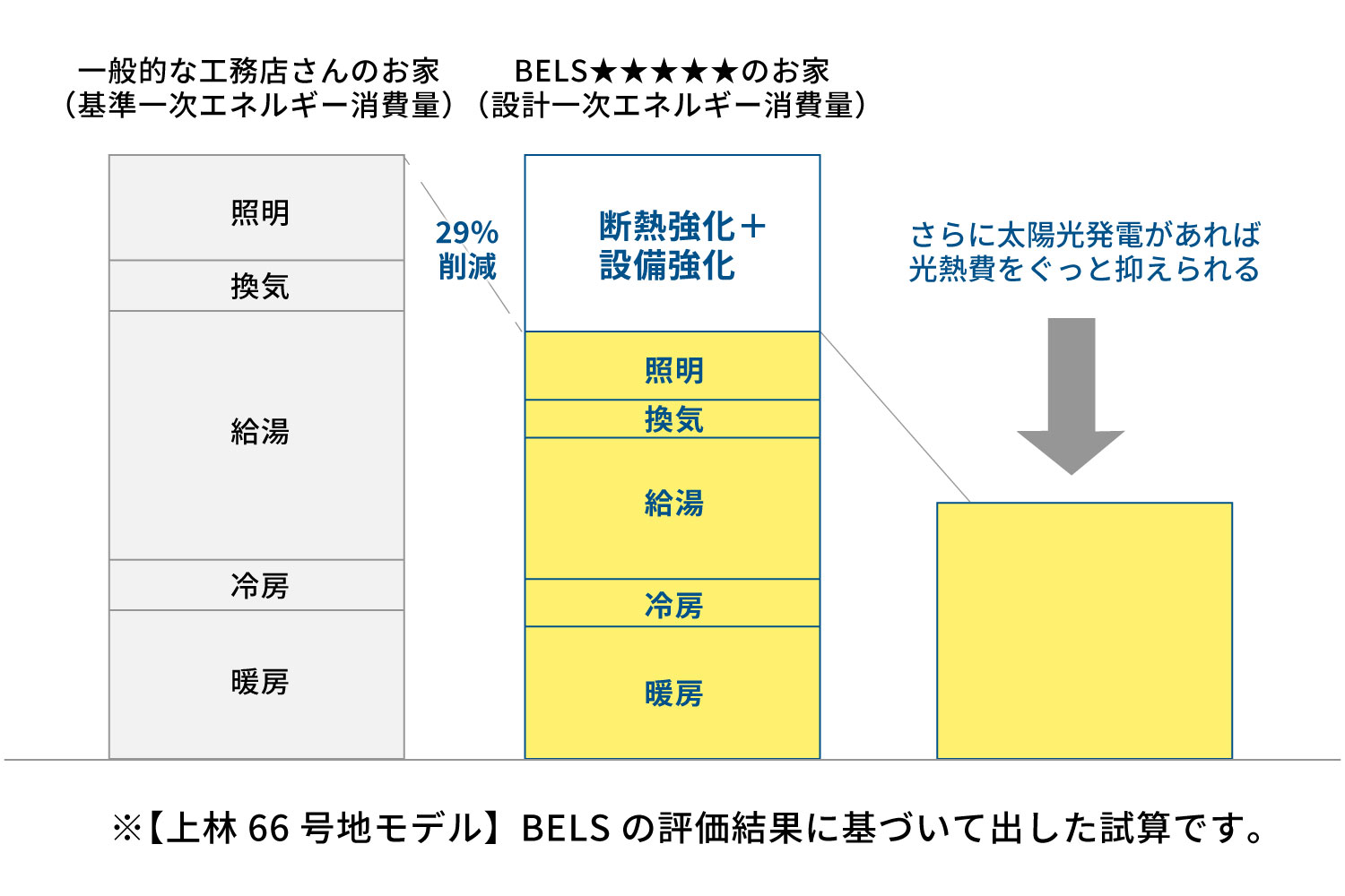 ロータリーハウスの標準構造・仕様で建築したアップガーデン上林Ⅱ66号地モデルハウスでは、一次エネルギー消費量を基準一次エネルギー消費量より29%削減することが出来ました。