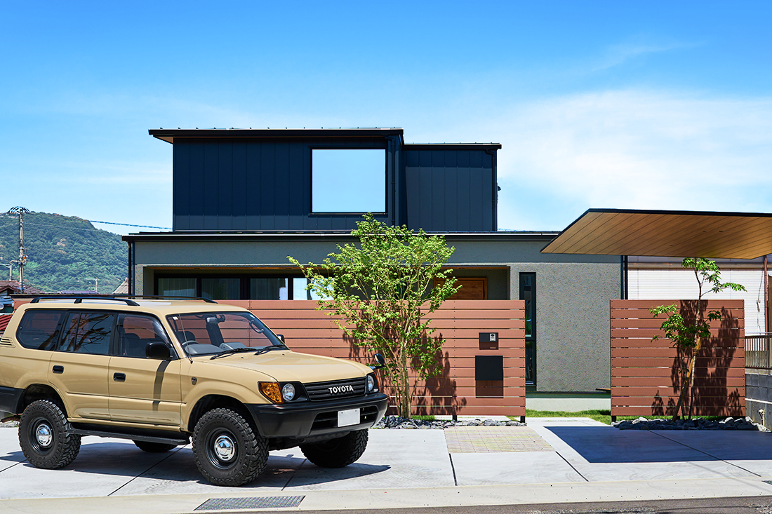 ガルバリウムと吹付塗装で仕上げた、カッコよさも落ち着きも感じられる外観。高さのある目隠しフェンスでプライベートも確保しました。