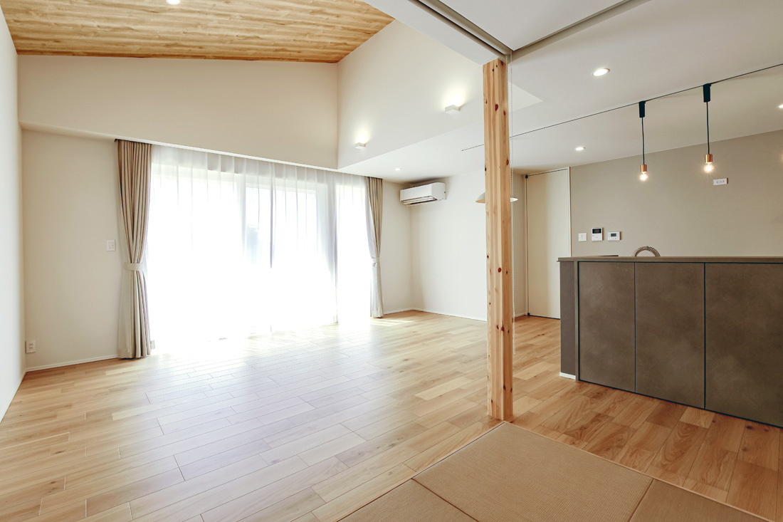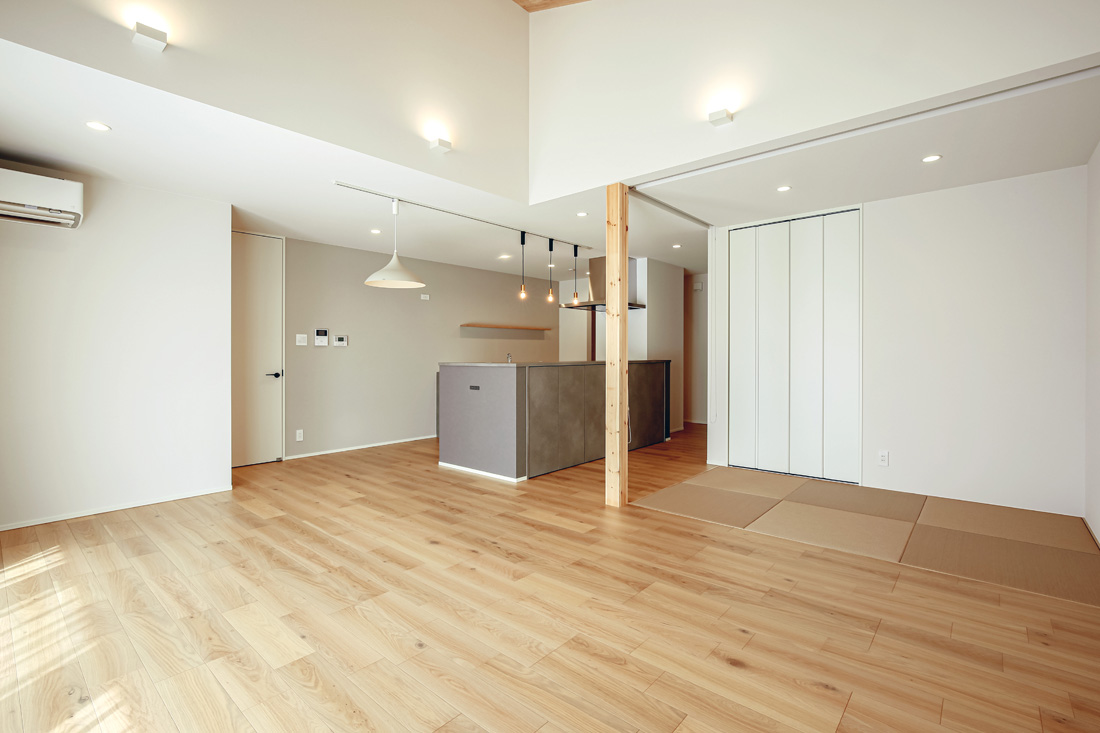 木目の柔らかさが際立つ明るいLDK。空間を一体に見せることで、より開放的に感じられます。
