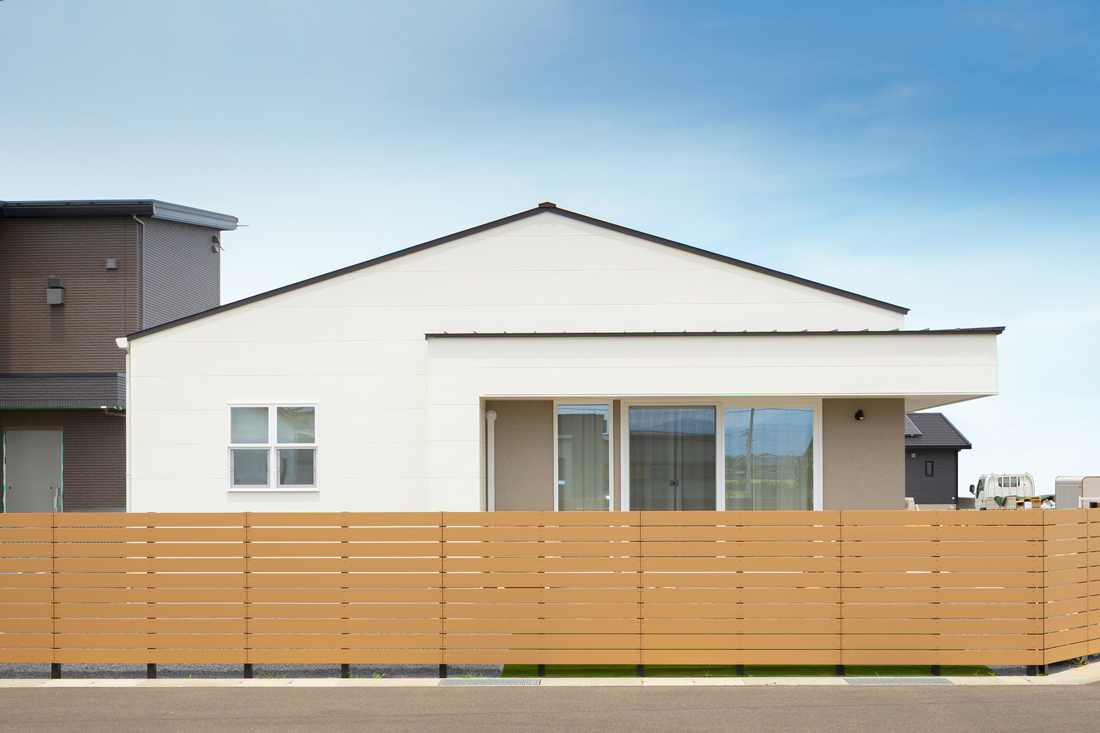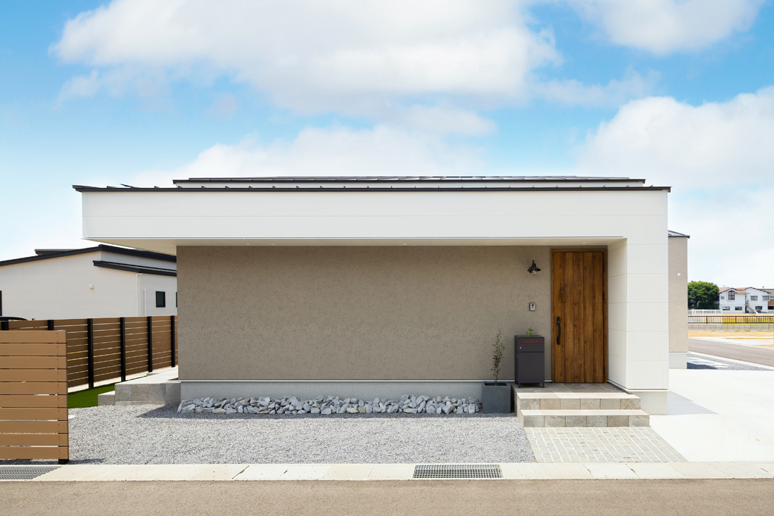 ホワイト×ベージュのナチュラルな外観。軒を出した立体的なシルエットが高いデザイン性を感じさせます。