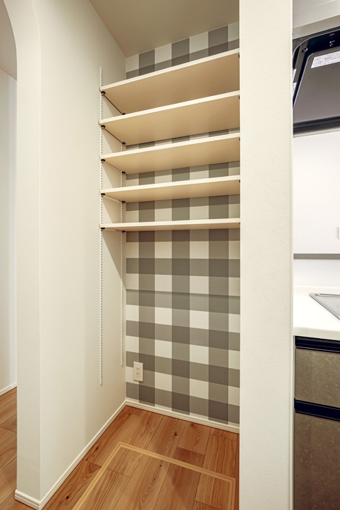 キッチンの隣にはパントリーがあり、お料理に必要な細々とした物やストック品を整理しておけます。アクセントクロスも◎