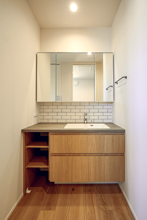タイル柄がポイントの洗面化粧台。収納がたっぷり取られているので、すっきり片付き気持ちよく使うことができます。