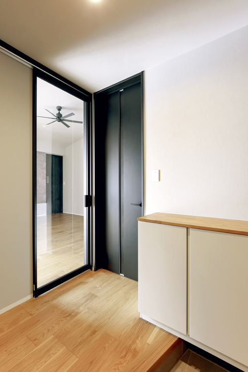 玄関ホールとLDKをつなぐドアはクリアで抜け感があるので、空間を明るく見せてくれます。