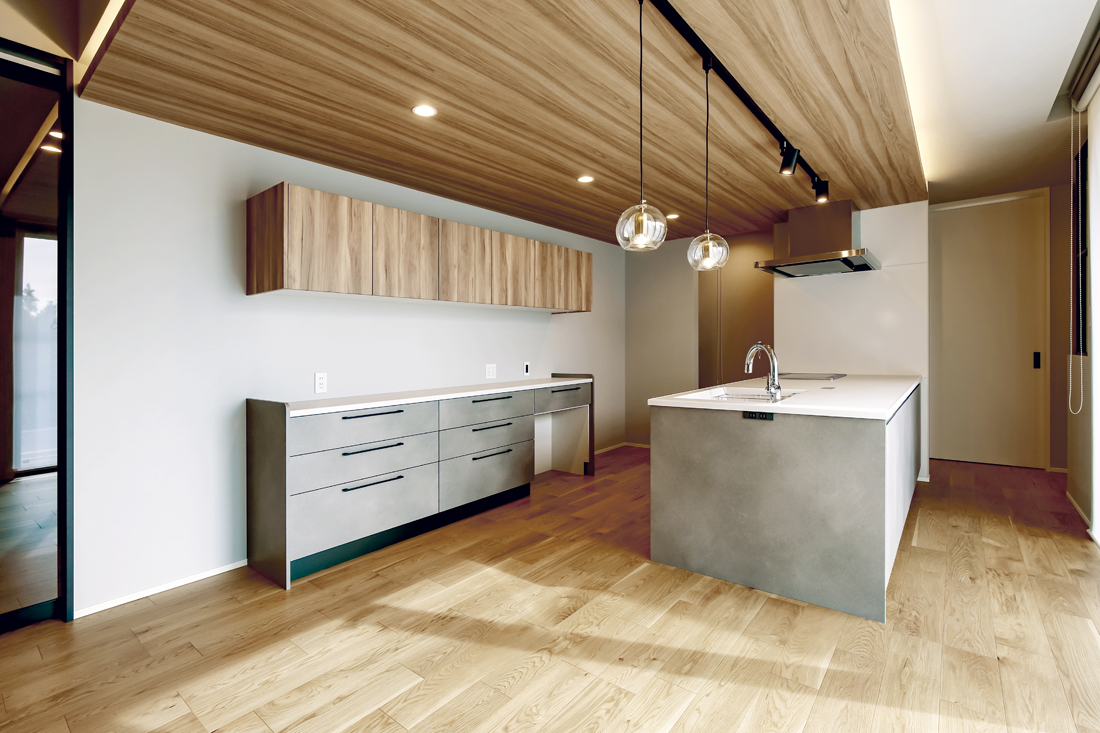 キッチンは回遊できるようになっており、家事がスムーズに行えます。収納力のあるカップボードと吊り戸棚ですっきり保てるのも嬉しいポイント。
