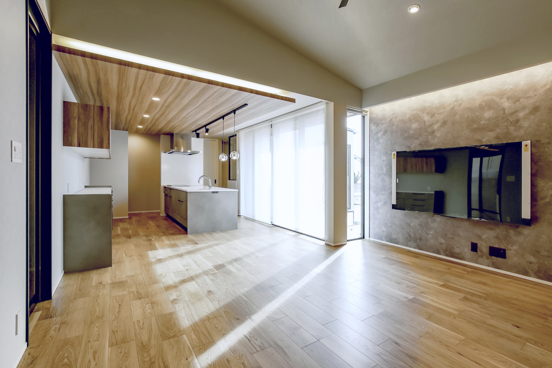 テラスに面した窓から明るい光が入るLDK。TVコーナーと天井の木目部分に間接照明を施しており、より奥行きの感じられる空間になっています。