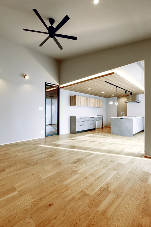 リビング部分は高さのある勾配天井によって開放的に仕上げました。