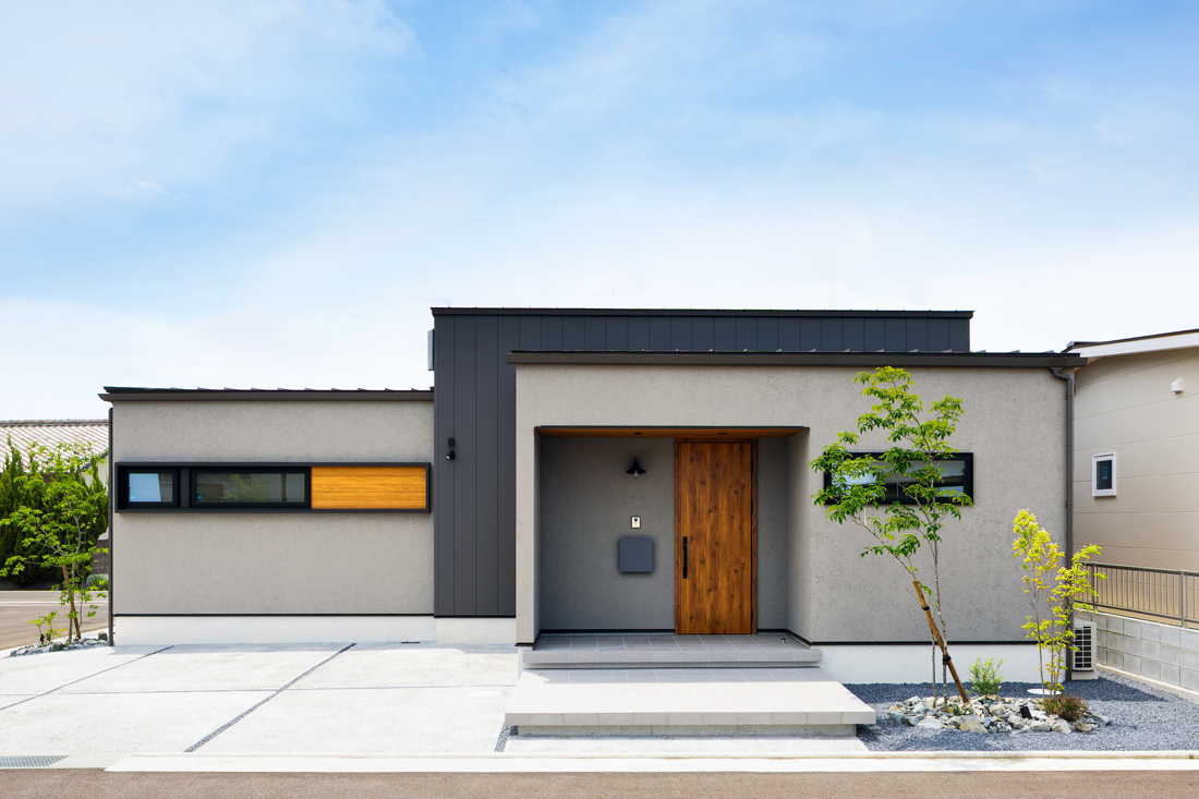 グレーの吹付塗装とダークグレーのガルバリウムを組み合わせたクールな外観。窓の意匠にあしらわれた木目がポイントになっています。