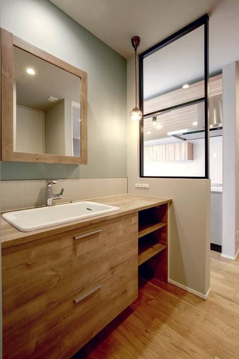 洗面化粧台は廊下に設けています。室内窓を採用することでデザイン性アップだけでなく、圧迫感も抑えられ気持ちよく使えます。