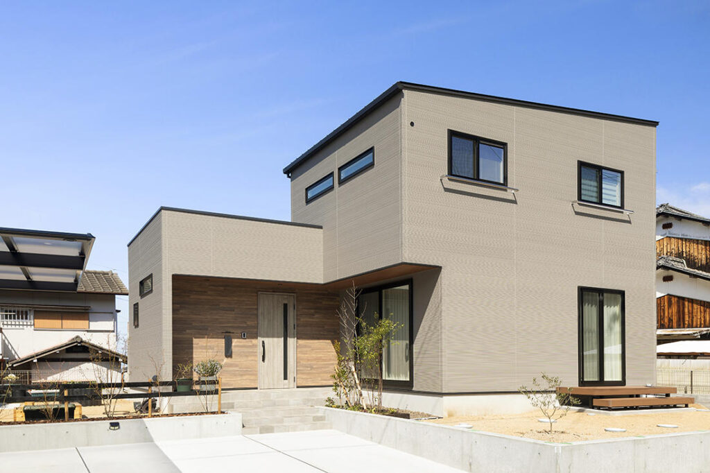 グレージュの吹付塗装とホワイトのガルバを組み合わせた外観。三角屋根を並べたようなフォルムが特徴的。