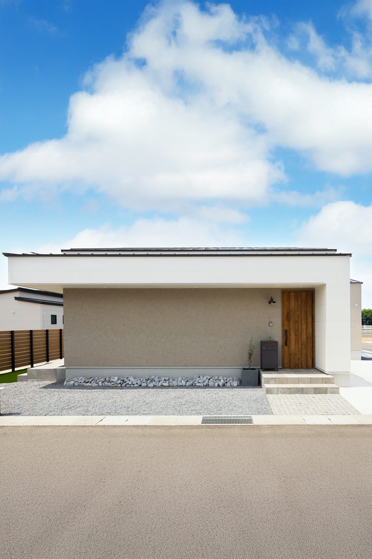 吹付塗装の白い外壁の素材感が目を惹く平屋